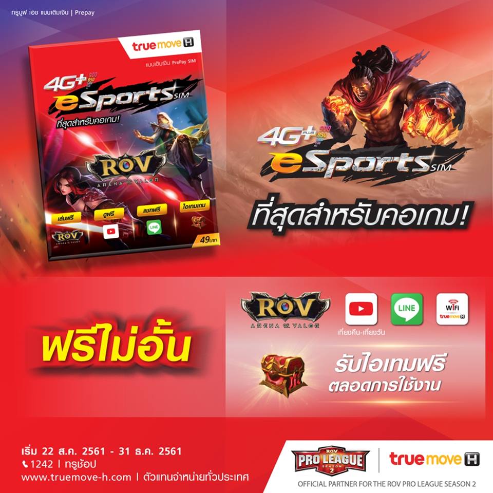 TrueMove เปิดตัวซิมใหม่ 4G+ eSports SIM ซิมที่จะช่วยให้ผู้ใช้งาน สามารถเล่นเกมได้ฟรีไม่อั้น เหมาะสำหรับคอเกมโดยเฉพาะ โดยซิมนี้จะสามารถใช้เล่น ROV , ดูคลิปบน Youtube ,แชท LINE ได้ฟรีไม่อั้น และ True Wifi Free ไม่อั้น พร้อมรับไอเทมภายในเกม ROV อีกด้วย ไม่ว่าจะเป็น Magic Store , ชิ้นส่วนฮีโร่ , เพชรแดง และพิเศษสุดๆ ผู้ใช้งาน eSports SIM สามารถรับ Excusive Skin ที่ไม่มีขายใน ROV รับได้เฉพาะคนที่เปิดใช้งาน eSports Sim เท่านั้น และรับไอเทมฟรีๆ แบบนี้ตลอดการใช้งาน