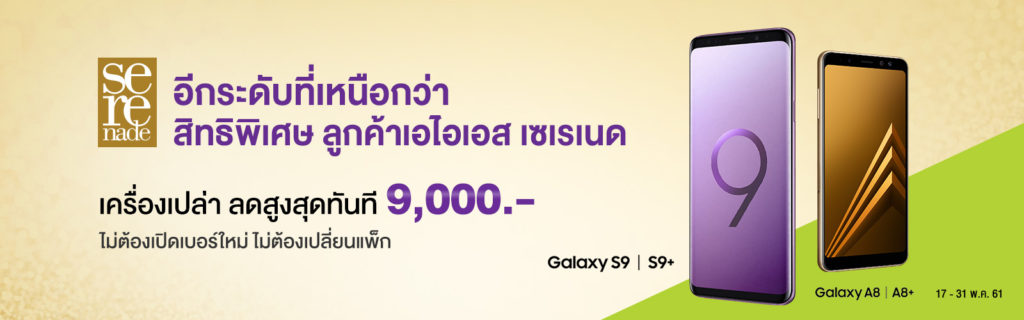 AIS เปิดโปรโมชั่นพิเศษ สิทธิสำหรับลูกค้า AIS Serenade และลูกค้า AIS รายเดือนที่ใช้งานแพ็กเกจขั้นต่ำ 899 บาทขึ้นไป ได้ส่วนลดราคาเครื่องเปล่า Samsung Galaxy S9 , Samsung Galaxy S9+ 64GB/256GB , Samsung Galaxy A8+ และ Samsung Galaxy A8 สูงสุด 9,000 บาท โดยไม่ต้องเปิดเบอร์ใหม่ และไม่ต้องเปลี่ยนแพ็กเกจ โปรโมชั่นนี้มีตั้งแต่วันที่ 17-31 พฤษภาคม 2561 โดยส่วนลดดังกล่าวมีดังนี้