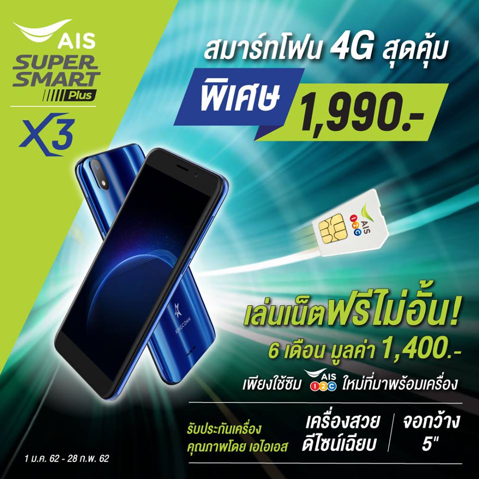 AIS เปิดตัวสมาร์ทโฟน 4G ราคาย่อมเยาว์ในแบรนด์ของตัวเอง โดยใช้ชื่อรุ่นว่า AIS Super Smart Plus X3 เครื่องสวย ดีไซน์เฉียบ รองรับการใช้งาน 2 ซิม จอกว้าง 5 นิ้ว แบบ FHD โดยจัดโปรโมชั่นพิเศษในราคาเพียง 1,990 บาท เล่นเน็ตได้ไม่อั้นนาน 6 เดือน มูลค่า 1,400 บาท เพียงใช้ซิม AIS ใหม่ที่มาพร้อมเครื่อง รับประกันคุณภาพโดย AIS โปรโมชั่นตั้งแต่ 1 มกราคม – 28 กุมภาพันธ์ 2562 ที่ AIS ช้อปทุกสาขา