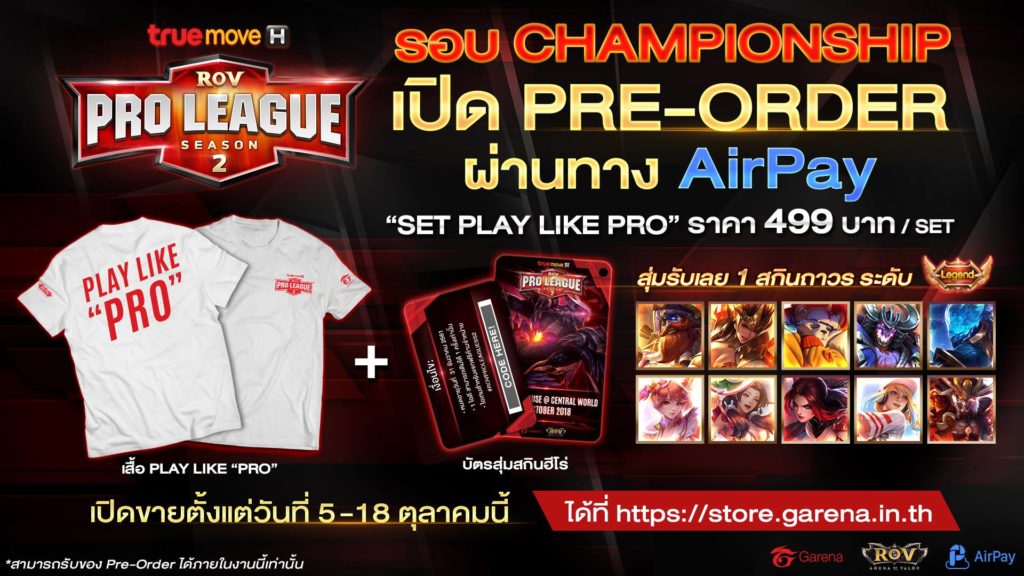 Gerena ROV Thailand จับมือกับ TrueMove H ในรายการ ROV PRO LEAGUE Season 2 รอบ Championship เปิดให้จอง Pre Order ผ่านทาง AirPay สำหรับเสื้อ PLAY LIKE “PRO” สุด Limited + บัตรสุ่มสกินฮีโร่ระดับ Legend 1 สกินถาวร (Cap’N Grakk , Divine Firestone Taara , Tooth Furry Zuka, Evil Shogun Maloch , Galaxia Murad , Melody Liliana ,Summer Goddess Diao Chan , Dark Warrior Butterfly , Home Runner Astrid และ Bloodthirst Ryoma) ในราคา 499 บาท/SET โดยจะเปิดให้จองได้ภายในงานนี้เท่านั้น ระยะเวลาเปิดขาย: 5 ต.ค. 2561 เวลา 17:00 น. – 18 ต.ค. 2561 เวลา 20:00 น. ใครอยากได้ต้องรีบจองกันหน่อย เพราะของมีจำนวนจำกัดจ้า สั่งซื้อได้แล้วที่ https://store.garena.in.th/