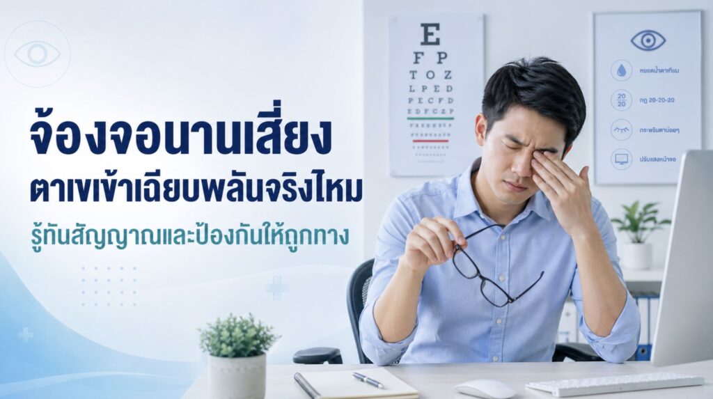 การจ้องจอคอมพิวเตอร์นานๆ นั้นไม่ใช่สาเหตุที่ทำให้ทุกคนเป็นตาเขเข้าเฉียบพลัน แต่สามารถเพิ่มภาระให้ดวงตาและอาจเป็นตัวกระตุ้นในบางคนได้ โดยเฉพาะคนที่ใช้มือถือหรือทำงานระยะใกล้ต่อเนื่องนานมากทุกวัน จุดที่ควรใส่ใจคืออย่ามองอาการผิดปกติของตาเป็นเรื่องเล็กเสมอไป เพราะอาการอย่างเห็นภาพซ้อนหรือตาเบนเข้าไม่ใช่อาการล้าตาธรรมดา แนวทางป้องกันที่ดีที่สุดคือใช้จออย่างมีจังหวะพัก เพิ่มระยะห่างจากหน้าจอ กะพริบตาให้มากขึ้น ปรับสภาพแวดล้อมให้เหมาะ และหมั่นสังเกตความเปลี่ยนแปลงของสายตาตัวเอง หากเริ่มมีอาการผิดปกติ การไปตรวจเร็วจะช่วยให้รู้สาเหตุชัดและแก้ปัญหาได้ตรงทางมากกว่าเดิม